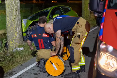 die tegen de boom gecrashed was. Duikers van het brandweerteam gingen het water