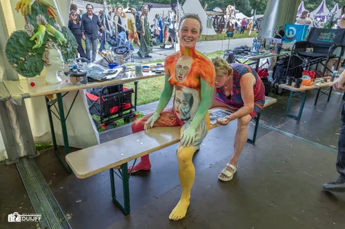Op het festivalterrein ook een locatie waar de kunst van body-painting wordt bedreven. Alle beelden daarvan werden genomen met toestemming van de figuranten.