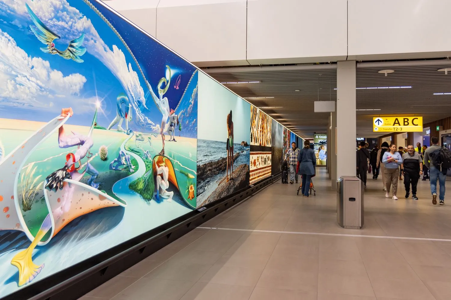 SCHIPHOL – Sinds deze week kunnen reizigers in Lounge 1 op Schiphol de tijdelijke kunstexpositie New Dutch Horizons bezichtigen. Deze ruim 200 meter lange expositie toont de visie van 19 Nederlandse kunstenaars op de natuur en cultuur van hun thuisland. Het is voor het eerst dat Schiphol een kunstexpositie bouwt rondom een bouwgebied op de luchthaven.